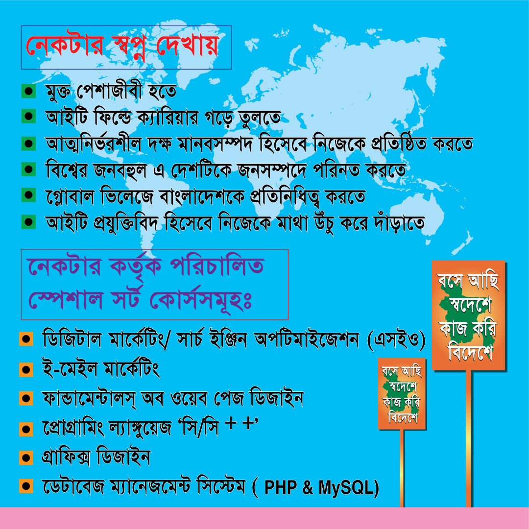 | ০২। | Fundamentals of Webpage Designing | নেকটার,বগুড়া। | ১২০ ঘন্টা/৩০ দিন। | ৬০ জন | বার্ষিক কর্মসম্পাদান চুক্তি অনুযায়ী |